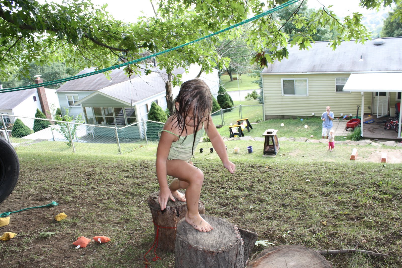 The kids opted to end the course by jumping in the pool. The professor and I chose the less adventurous method of tagging it. Winner of the backyard obstacle course....